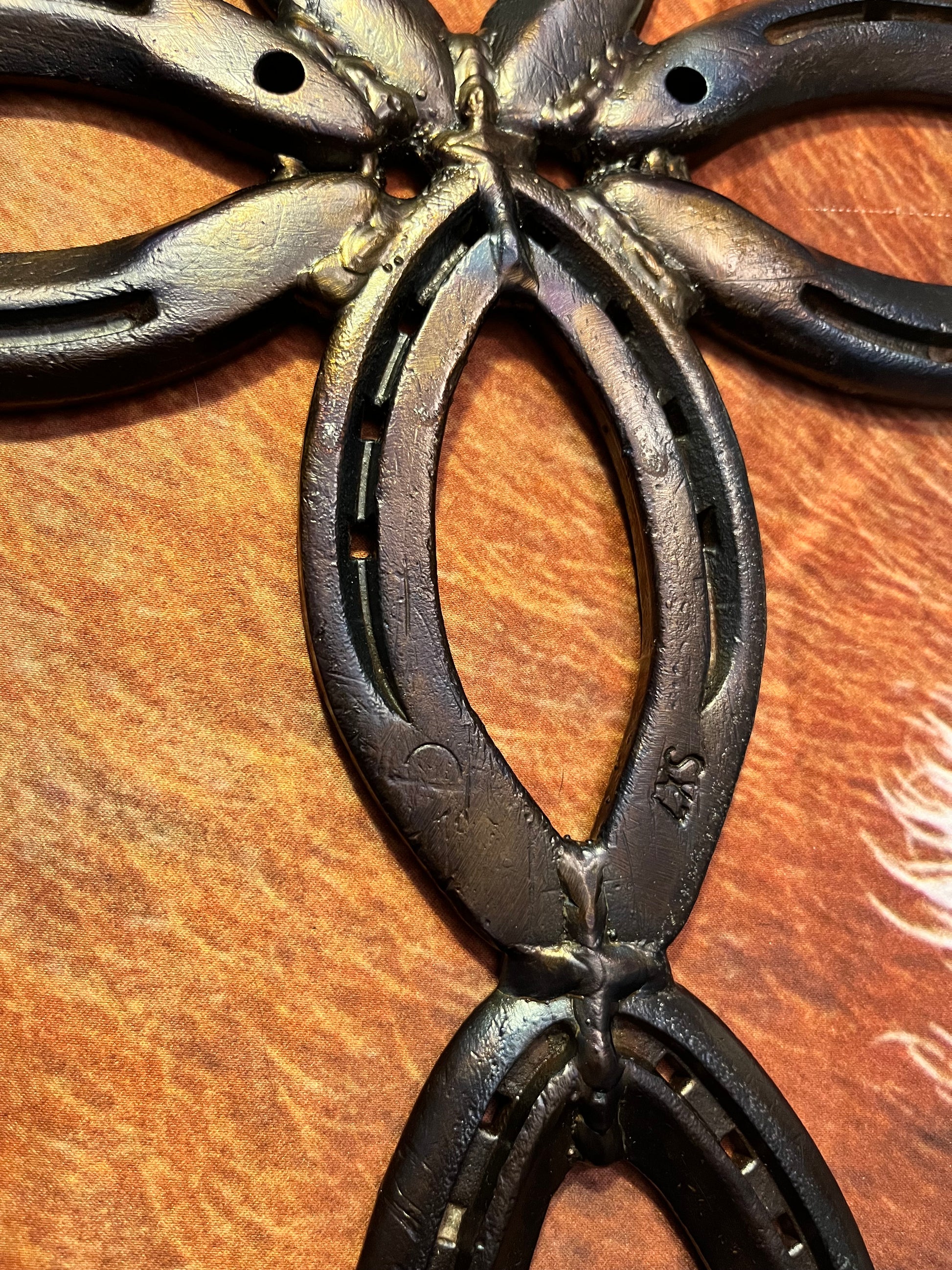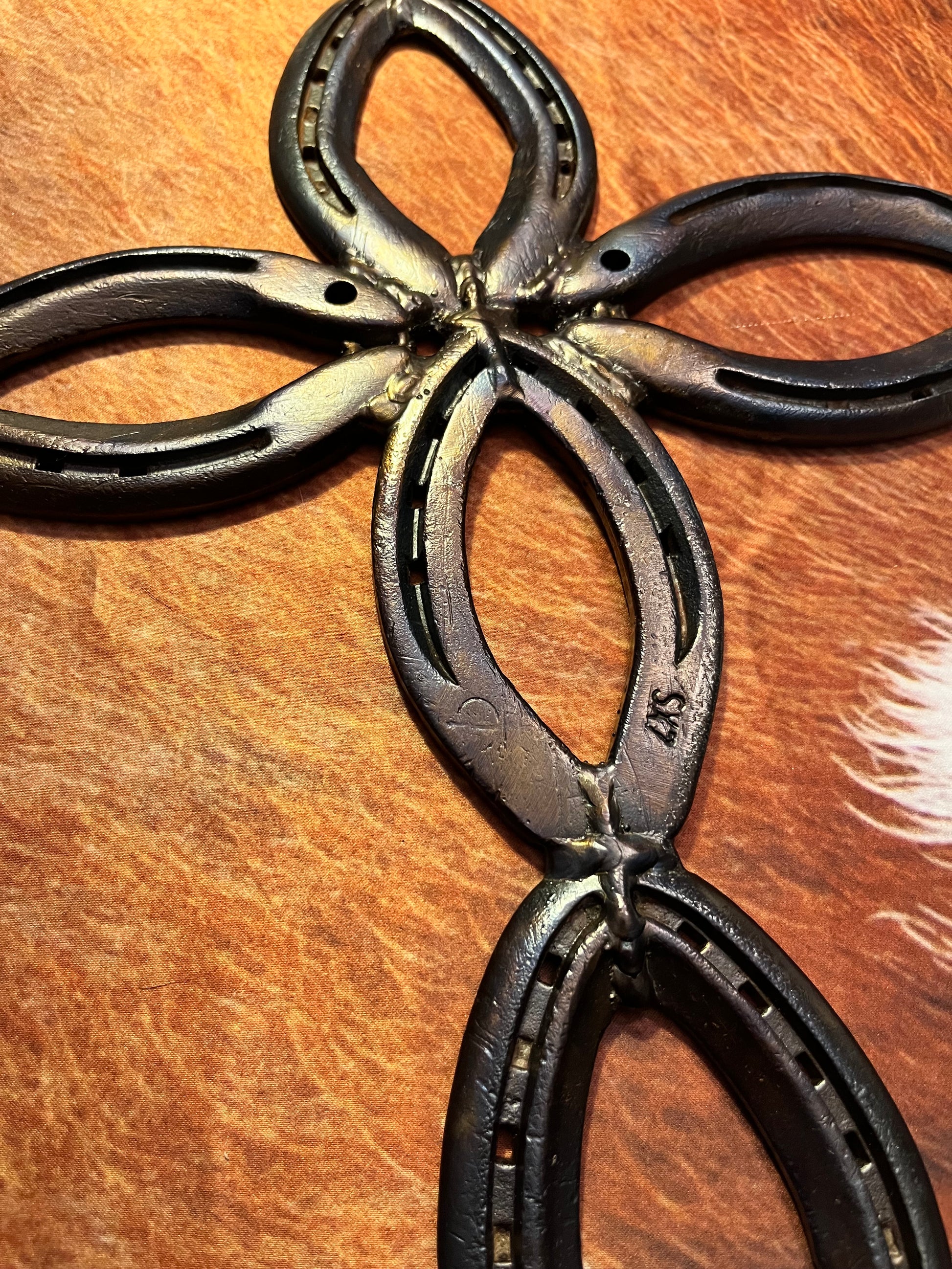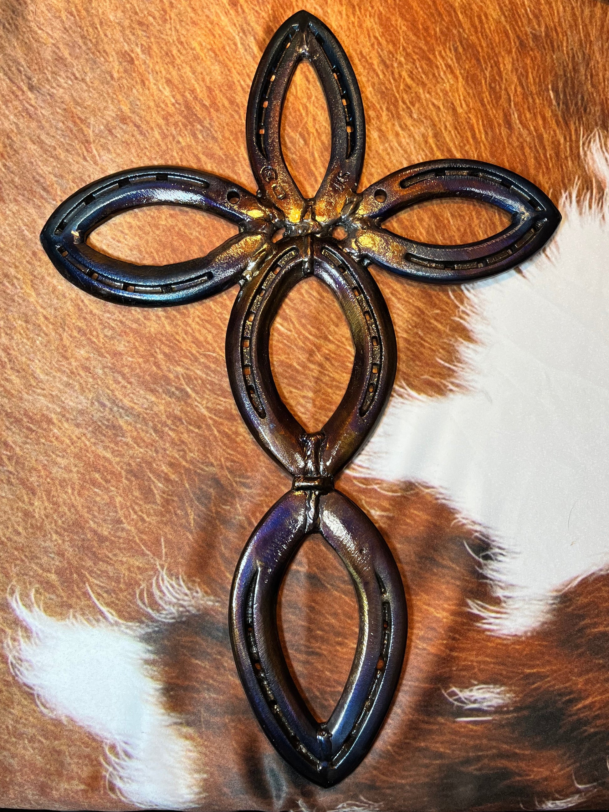 Horseshoe cross welded and torched to give it the coloring. Clear coated to protect.