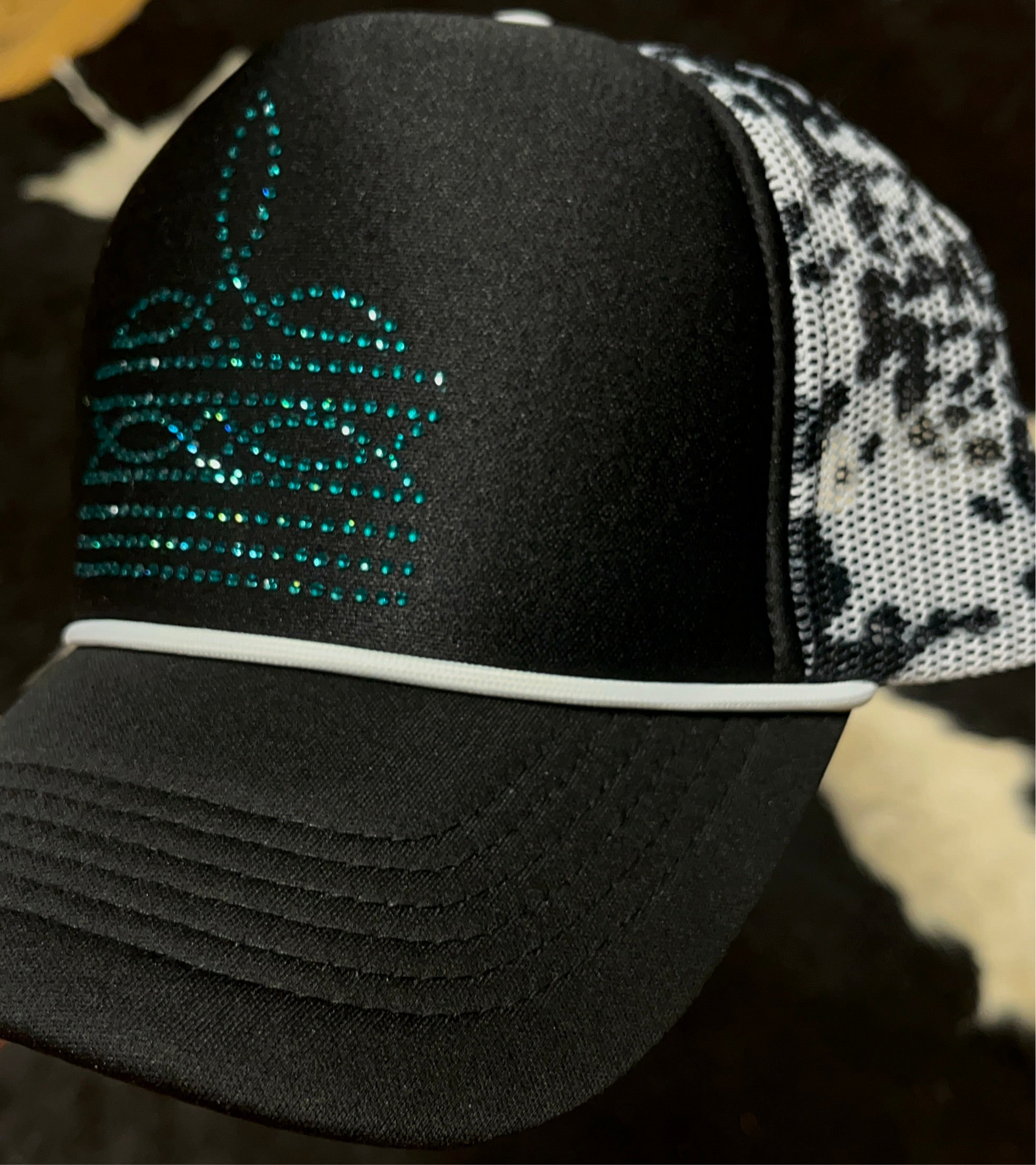 Rhinestone Boot Stitch Cow Print Trucker Hat