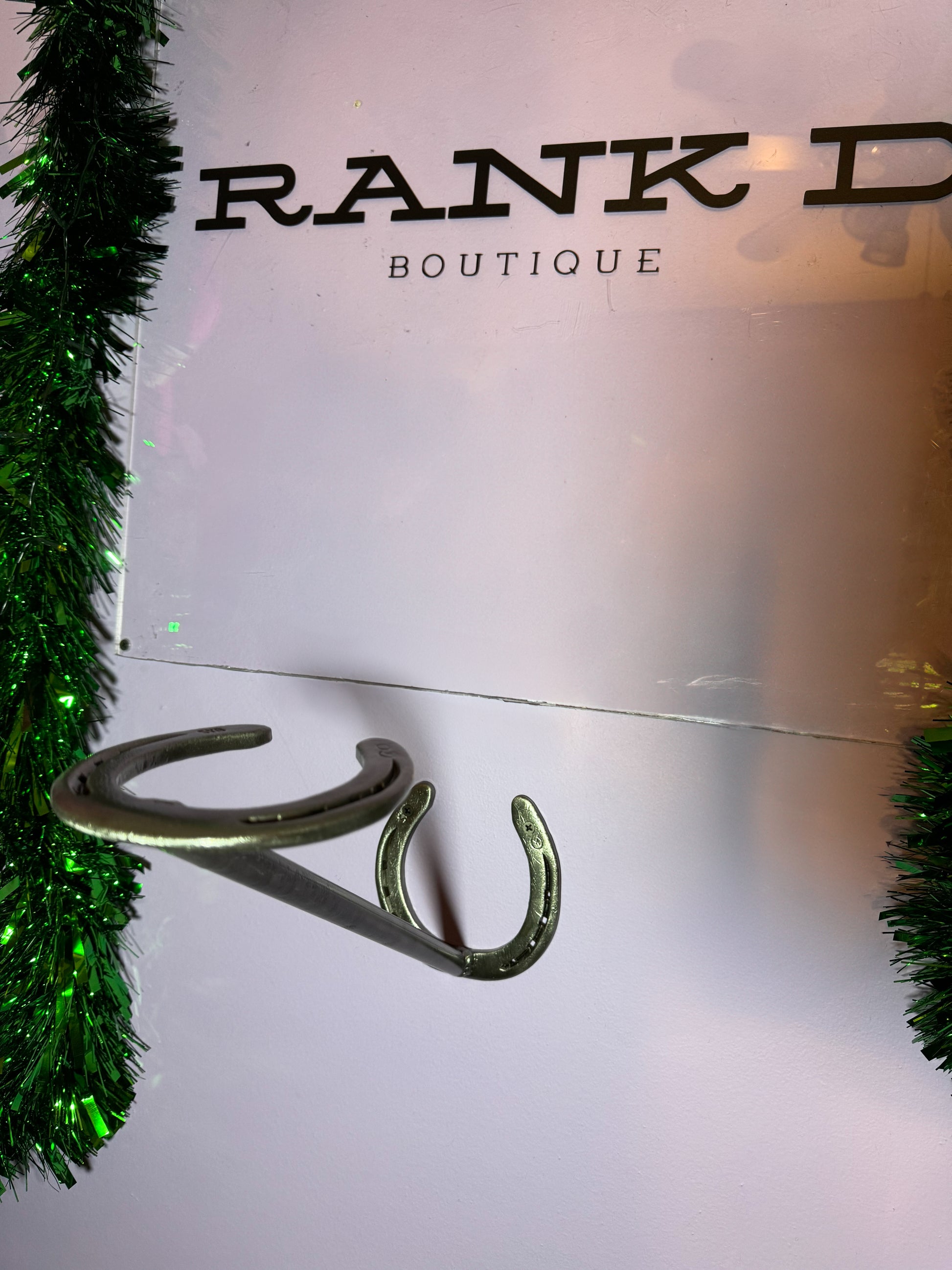 Horseshoes welded to make a cowboy hat holder that is mounted to the wall. Everything is welded and clear coated to protect the product.